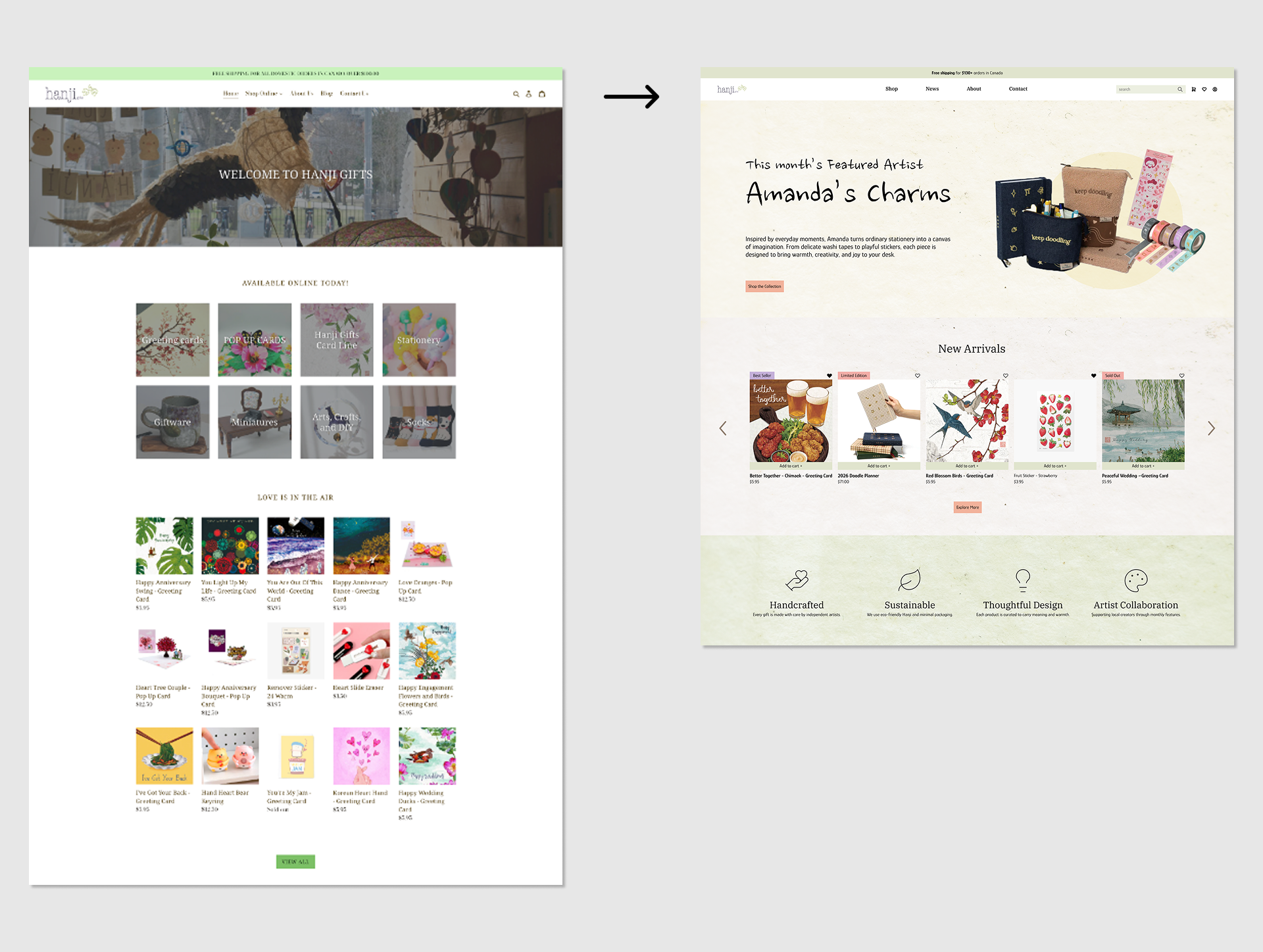 The hero section was restructured to prioritize discovery and brand storytelling over immediate product listing. Featuring an artist-led collection helps users quickly understand the value of Hanji while encouraging exploration in a calmer, more intentional way.