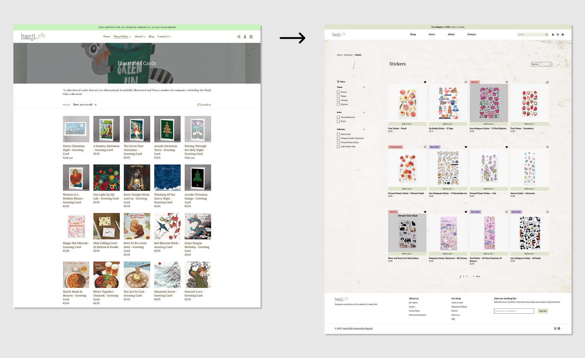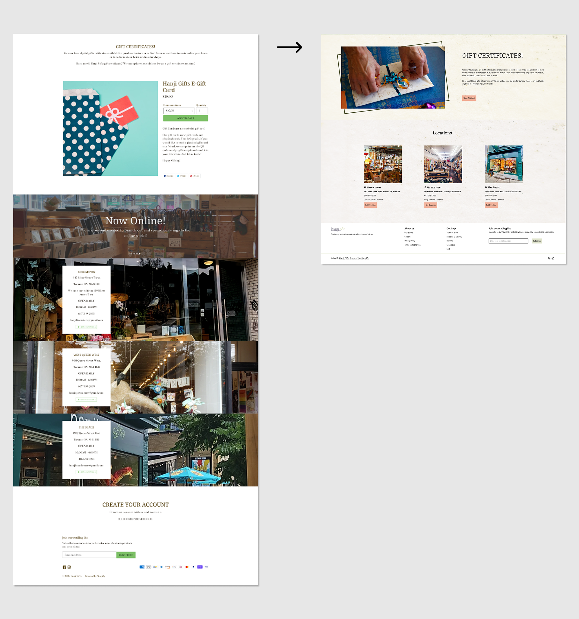 The footer and supporting sections were restructured to improve usability and clarity. Practical information such as gift certificates and store locations is clearly organized, helping users navigate effortlessly while reinforcing trust and accessibility.